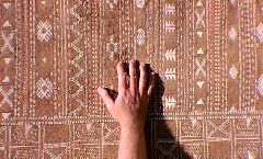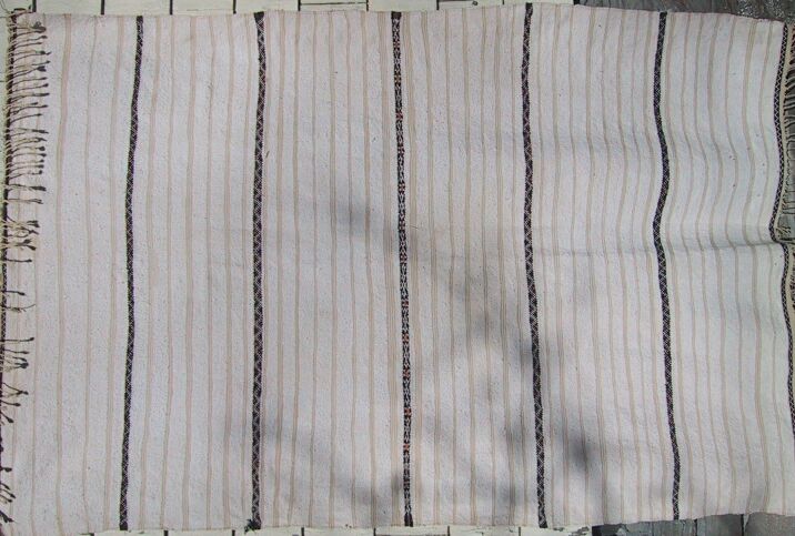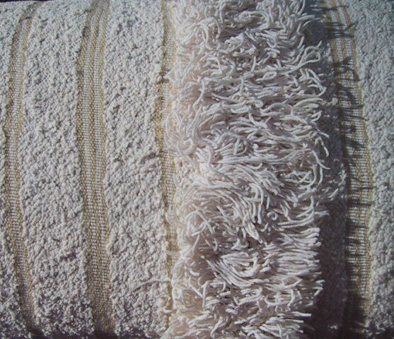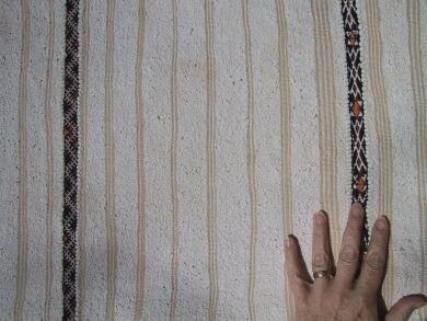 Piece 3.13683 is a woman's cape from the Middle Atlas Mountains made of wool and nubby white cotton, with thin design stripes in black, white, rust and gold; click the photo to see them clearly. You can see the full piece here; don't worry about the dark areas, which are only shadows. There are a few pale spots that look like rust, almsot inevitable in older pieces, but they are not prominent. It is very finely-woven, as you can see from his close-up of the end fringe. That shows the thickness of the warp or lengthwise threads. This detail shows the back side, where the design stripes are covered by fringe, traditional in these pieces. The size is 3'10.5" x 5'10" (118 x 177cm) and the price is $145. This is SOLD, but I could shop for a similar one on request.