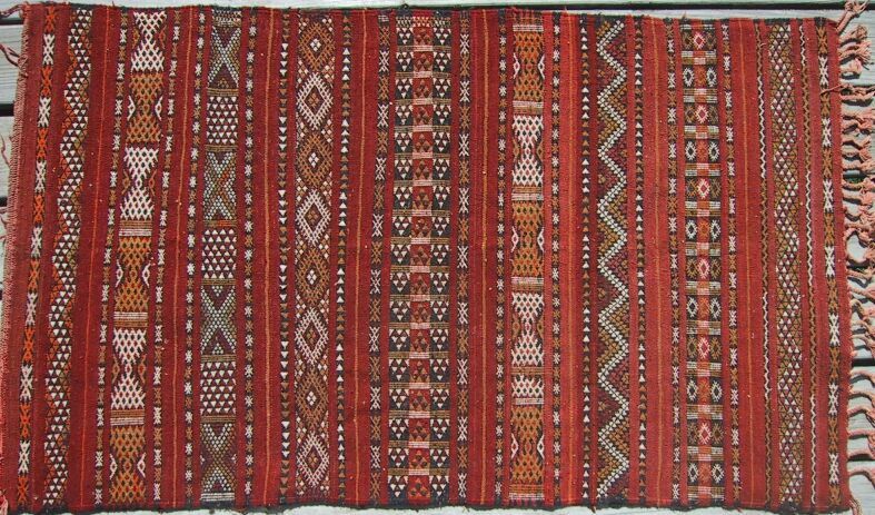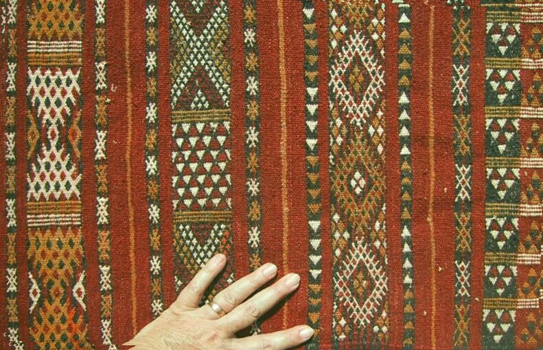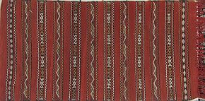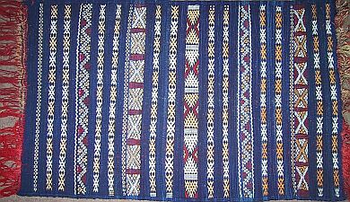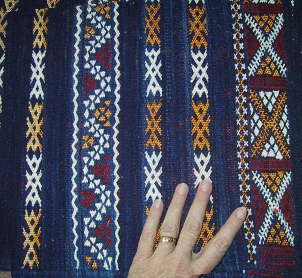 Piece 3.13111 is a small Zemmour style rug in design, but the rich blue color replacing the usual red ground is an innovation, perhaps for the Western market. The design stripes are traditional in form, and the red and white are traditional colors, but the soft gold in a shiny fiber is new, probably replacing the orange that some Westerners find too bright. You can see them better here. This piece measures about 2'3" x 3'7" (68 x 109cm) and the price is $75. SOLD - BUT so many people liked this that I have asked a friend in Khemisset to make me a similar one, so stay posted to see if I can get more.