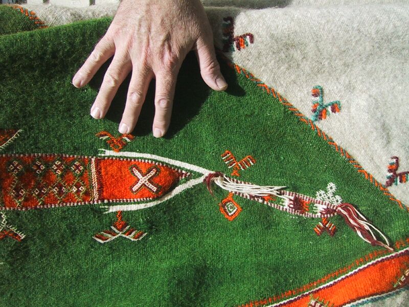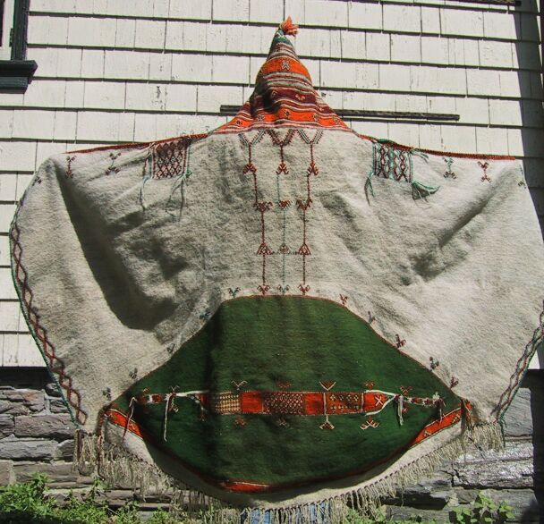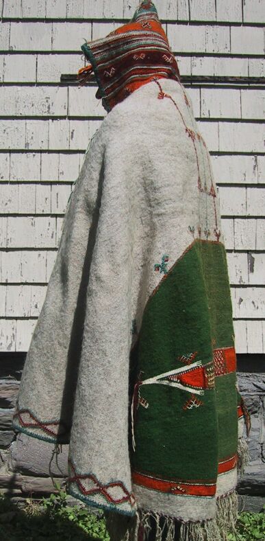 Piece 4.14011 is really unique. It's a wool cloak woven in the traditional akhnif style, in one color with a large "eye" on the back in another color. Tradiitonally these were black with a red "eye", but this is in a unisex natural beige with the eye in green. You can see a view from the back here, and a detail of the "eye" here. The last image shows the fineness of the work, and the colors also look more true on my screen. The green is not dull as it looks here, but lively. It is about 20 years old and costs $375. SOLD