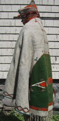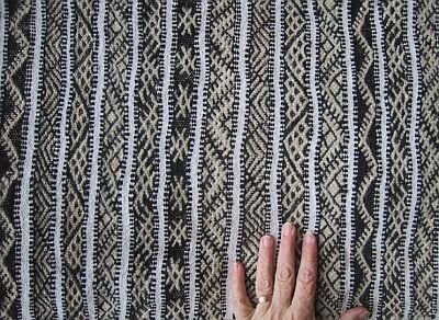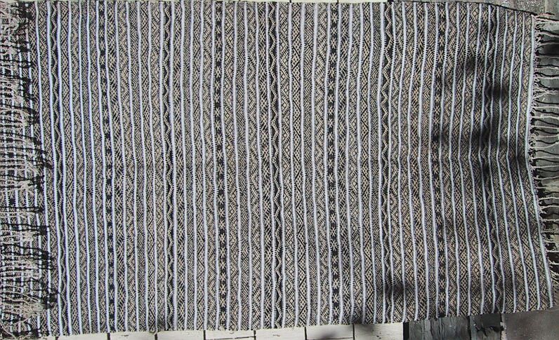 Piece 4.14476 is a black and white woman's cape with varied design stripes in white wool and cotton and black, which you can see by better clicking the photo. I like to see how far the design stripes go without repeating. Click here for an overview of the piece. I would use this on the floor in a low wear area, as a throw - or you could wear it. The wool is warm, but not heavy. The size is about 41 x 71 inches (104 x 180 cm) and the price is $165.